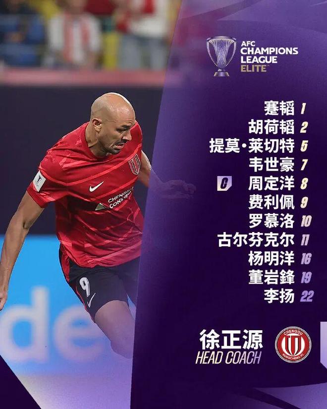成都蓉城首发:1-蹇韬、2-胡荷韬、5-提莫-莱切特、11-古尔芬克尔、19-董岩鋒、22-李扬、8-周定洋、10-罗慕洛、16-杨明洋、7-韦世豪、9-费利佩;